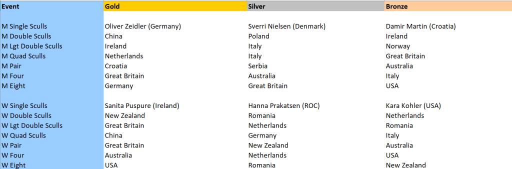 Other names to look out for are the Croatia brothers Martin and Valent Sinkovic, who have moved from the Double Sculls – which they won in Rio – into the Men’s Pair where they are double World Champions. Expect the Netherlands and New Zealand to both have strong medal chances in several events. In fact, both New Zealand and Australia may well out-perform my predictions for them – as far as I can tell neither country took part in the usual series of World Cup regattas, so their form is something of an unknown factor.