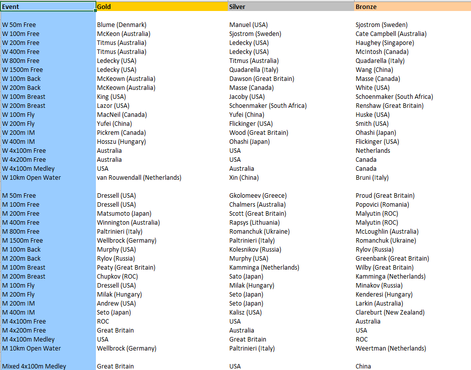 In other events, we see a renewal of the breaststroke rivalry between Lilly King (USA) and Yulia Efimova (ROC) that developed in Rio. The women’s 100m backstroke promises to be one of the standout events, with the potential for 3, maybe 4, women breaking the current world record if they are on form. Finally we have the ‘veterans’ – Katinka Hosszu (Hungary) and Sarah Sjostrom (Sweden) hoping to retain Golds, although Sjostrom is coming back from serious injury earlier this year.