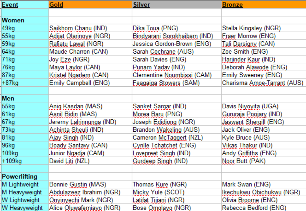 In terms of the para powerlifting, the last Games were dominated by Nigeria and I expect these to be the same, although look out for Bonnie Gustin of Malaysia to potentially prevent a Nigerian clean sweep of gold medals.