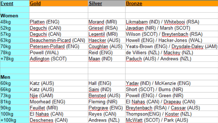 Given that fact, the overall Commonwealth medal table in the discipline is unsurprisingly dominated by England and Scotland, who have won 36 of the 44 gold medals contested in it. Both nations will hope to continue that trend at these gams. Be on the look out as well for three sets of siblings that will each be hoping for gold – the Deguchi sisters and El Nahas brothers (from Canada) and the Katz brothers from Australia all have realistic chances of taking the top step of the podium in their respective weight classes.